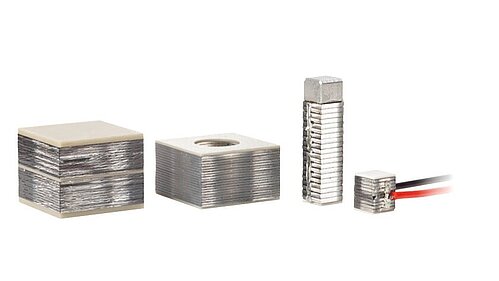 PI Ceramic’s Piezo Devices product division manufactures customized assemblies for sensor and actuator technology applications, and also actuator modules and stack actuators – manufactured as high-voltage assemblies, as standard products or with customer-specific modifications. Many of these products, >> stack actuators and actuator modules in particular, act as assemblies for PI's piezo drives. All of the elements can be manufactured as single pieces in mid-sized and large batches, and also with customer-specific adjustments.