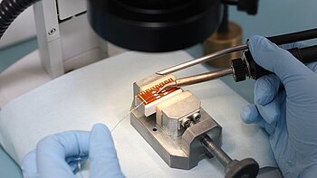 Standard contacts for piezo actuators are 100 mm stranded wires or soldering points. For each piezo element, different wires acc. to the AWG standard are used. PICA Shear for cryogenic and UHV environments use tantalum electrodes, which can be contacted by means of a conducting adhesive or by welding. Please observe the soldering instructions for each product.