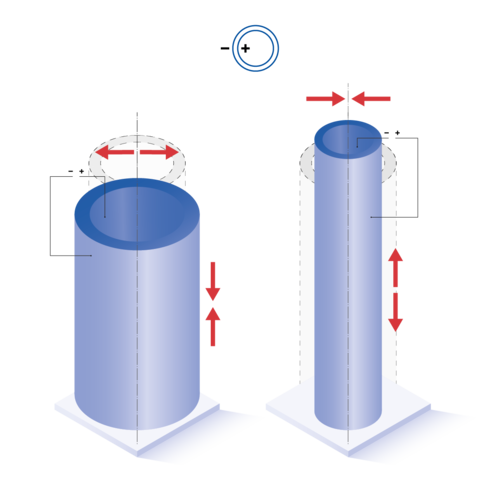 | Polarization direction | Depending on the contacting and attachment of the electrodes, different bending occur in the axial, radial and lateral directions. For more information see >> Operating Modes. |